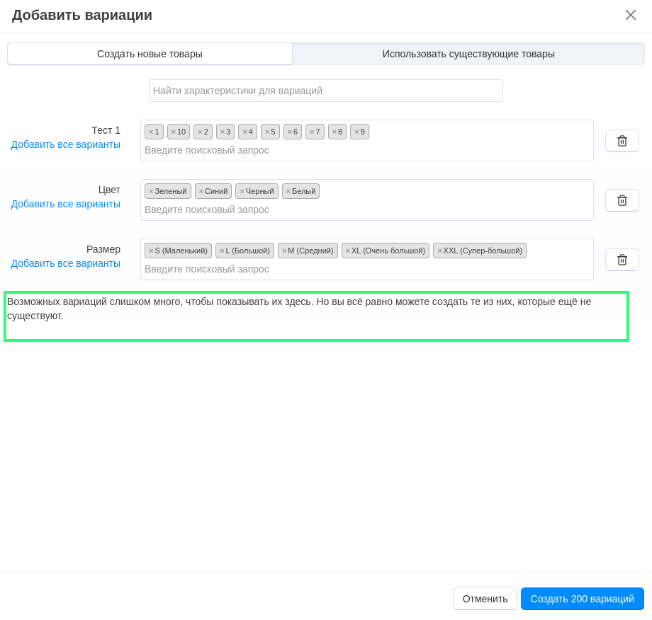 Также мы исправили проблему, когда окно создания вариаций не открывалось, если возможных сочетаний характеристик было очень много. Теперь список вариаций появится в окне, только если возможных вариаций меньше 100. Но создать при этом можно и больше вариаций.