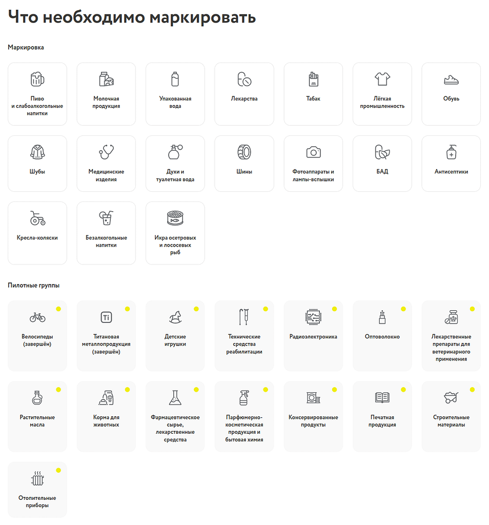 Российские законы начали требовать маркировку некоторых товаров ещё в 2019 году. Уже сейчас обязательны к маркировке товары легкой промышленности, обувь и лекарства А в 2024 году в России будет введена обязательная маркировка велосипедов, детских игрушек, растительных масел и кормов для животных. Уже сейчас количество категорий маркируемых товаров доходит до 16, и со временем их станет больше.