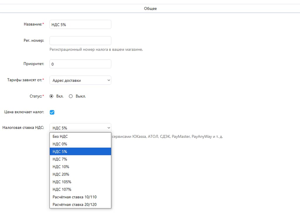 Теперь модуль поддерживает актуальные ставки НДС 5% и 7%., Чтобы их использовать, вам достаточно указать в одном из созданных налогов соответствие той или иной ставке. Для этого: