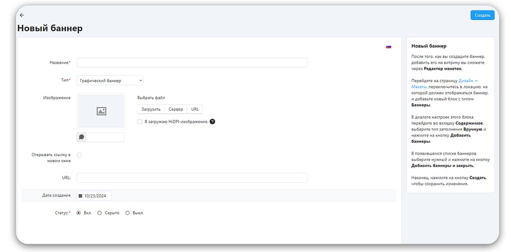 - Придумайте название, загрузите изображение, установите URL и статус.