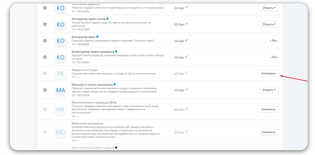 - В меню «Скачанные модули» найдите модуль «Лендинги из Tilda» и активируйте его.