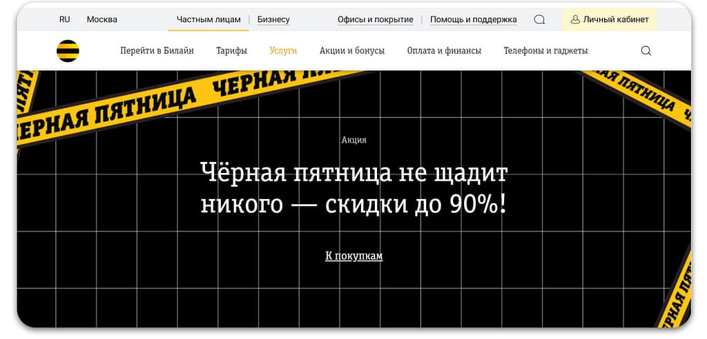 В качестве примера можно привести главную страницу сайта оператора сотовой связи Билайн — посетители сразу видят предложения о скидках, при этом баннер удачно вписан в общую айдентику бренда.