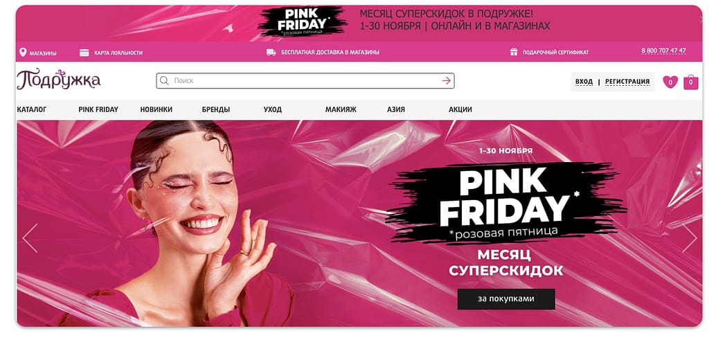 Зачем делать как все, если можно удачно внедрить свою айдентику? Именно так и поступила сеть магазинов косметики «Подружка», обыграв фирменный розовый оттенок и окрасив «Черную пятницу» в собственные цвета.