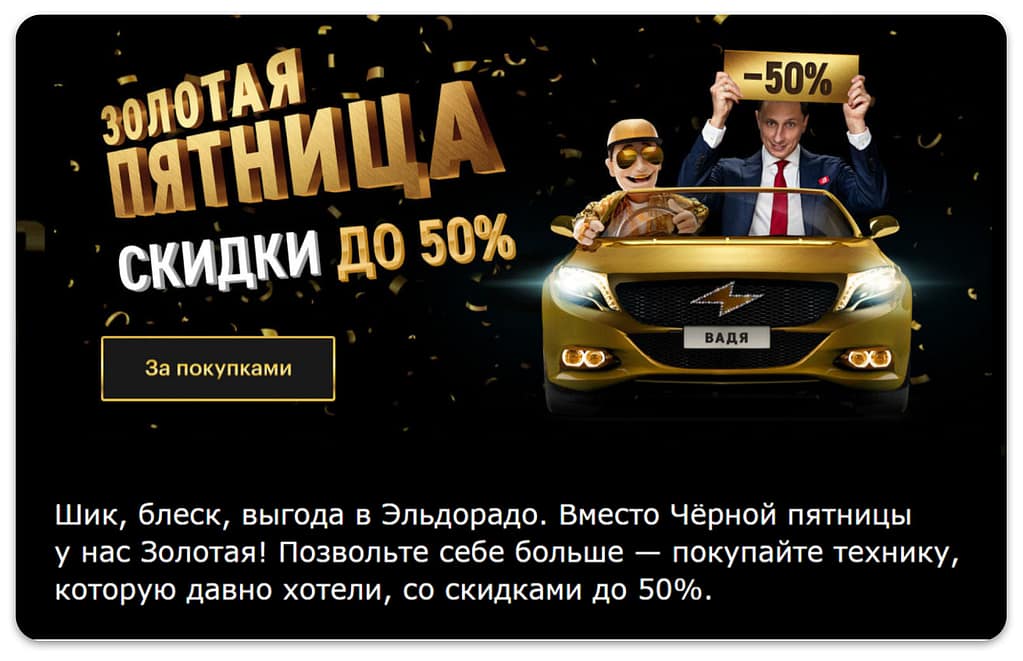 Также в яркое решение был оформлен магазин электронной и бытовой техники Эльдорадо. Бренд хоть и не использовал собственную айдентику, но сделал пятницу золотой, тем самым намекнув о больших скидках и крайне выгодных покупках.
