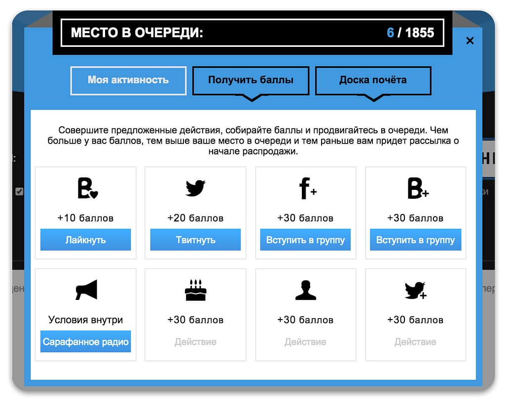 По умолчанию они находились в самом конце очереди, а для продвижения вверх нужно было набирать баллы. Баллы давались за определенные действия: лайки, репосты, подписка на соцсети, ссылки для друзей.