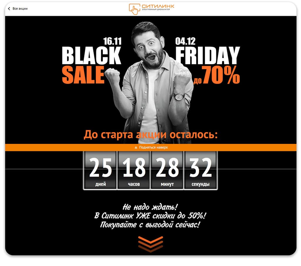 Так выглядел лендинг магазина электронной техники «СИТИЛИНК»: обратный отсчет, предоставление предварительных скидок, а также переадресация на правила проведения акции.