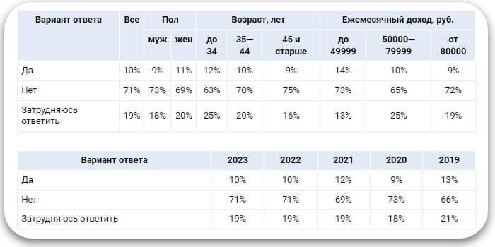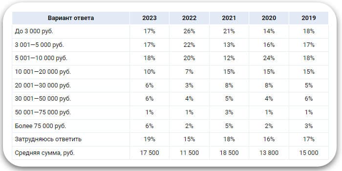 Большая часть сходится на тратах до 10 тысяч рублей, соответственно, чем больше итоговый чек, тем ниже процент. Однако по сравнению с 2022 годом количество покупателей, планирующих большие расходы, прибавилось.