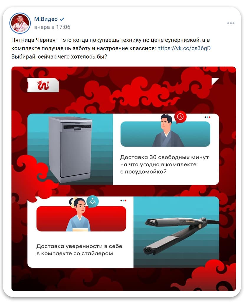 Пример магазина бытовой техники и электроники М.Видео, собирающего охваты перед началом «Черной пятницы» с помощью таргетированной рекламы
