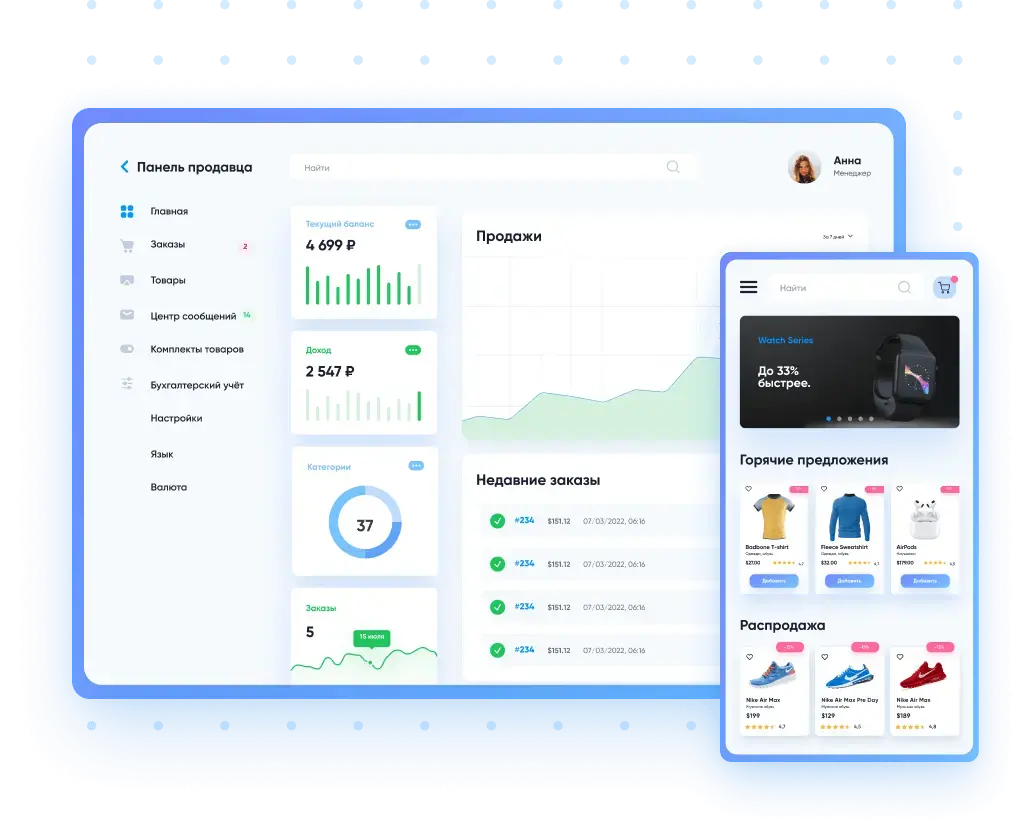 Простая в использовании панель администратора — одна из причин, почему клиенты выбирают нашу платформу для маркетплейса для своих проектов. Возможность самостоятельного управления маркетплейсом позволяет чувствовать себя вовлеченным в процесс работы маркетплейса и более рационально расходовать бюджет.